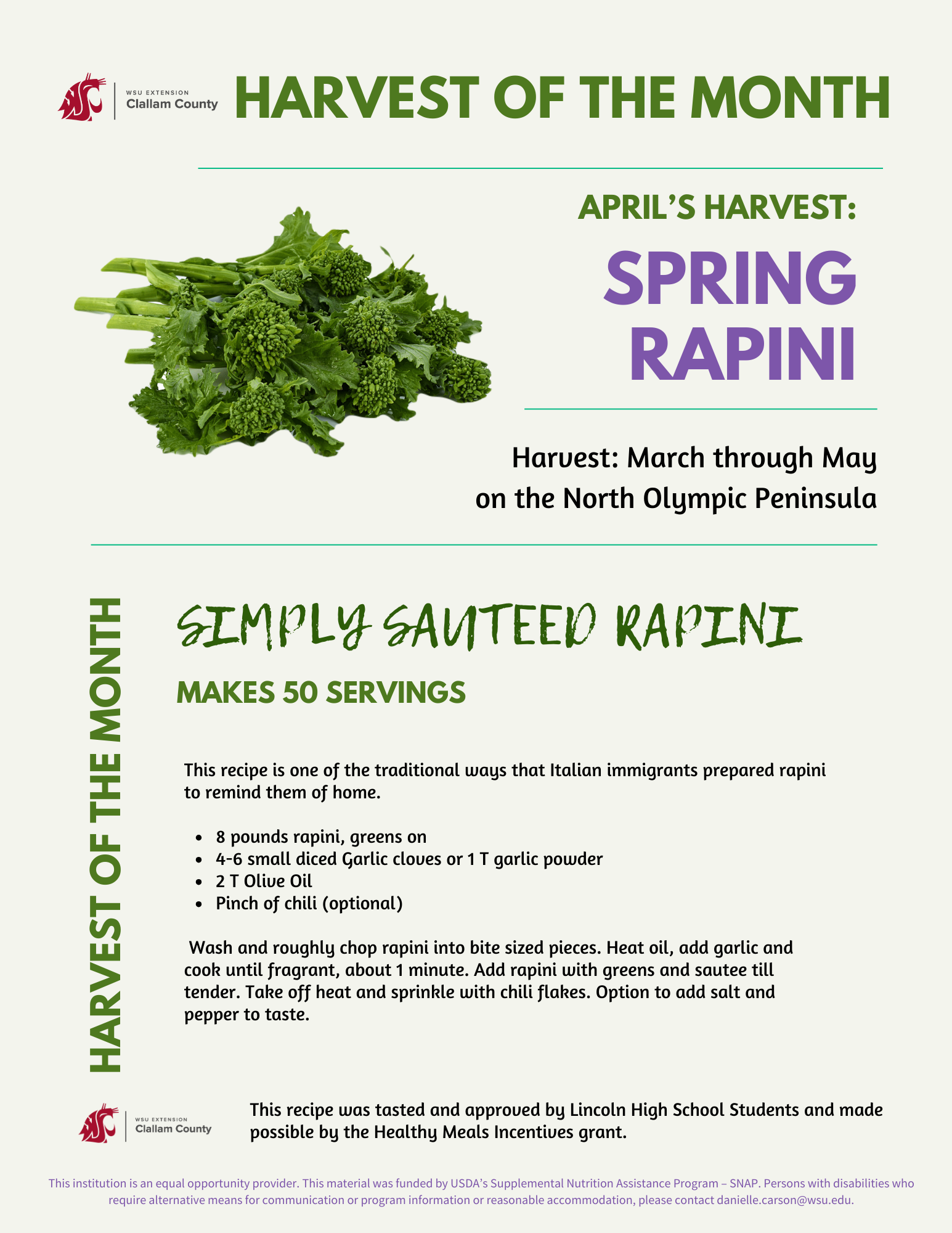 Thursday the 9th WSU Extension office and Linnie and Tammy are doing a taste test during lunch time. The kitchen will be sampling spring Raab from Chi's Farm in Sequim. This roasted flowering part ...
